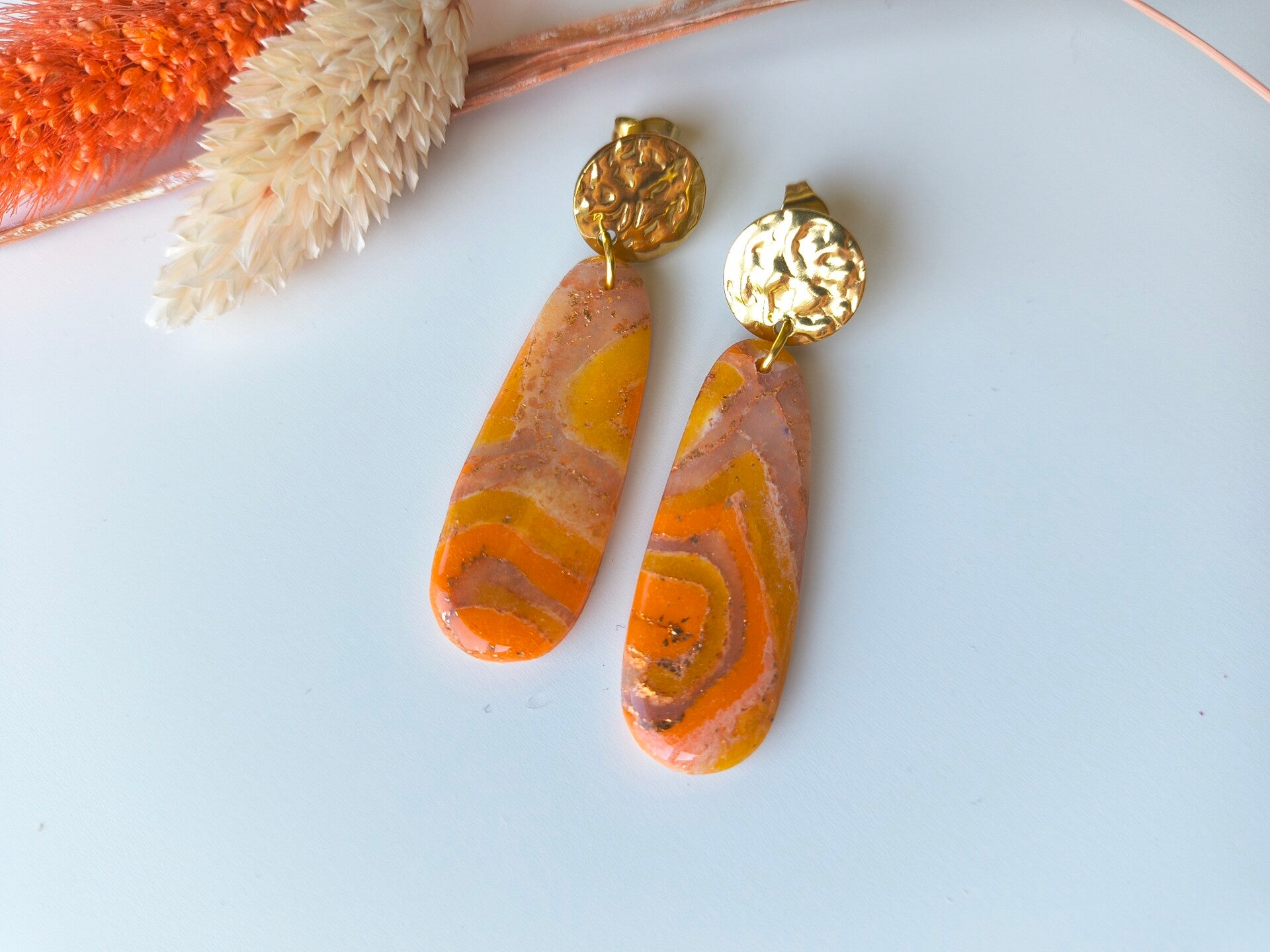 Stijlvolle roestkleurige oorbellen met rosé goudfolie afgewerkt. Een glanzend harslaagje maakt het helemaal af.