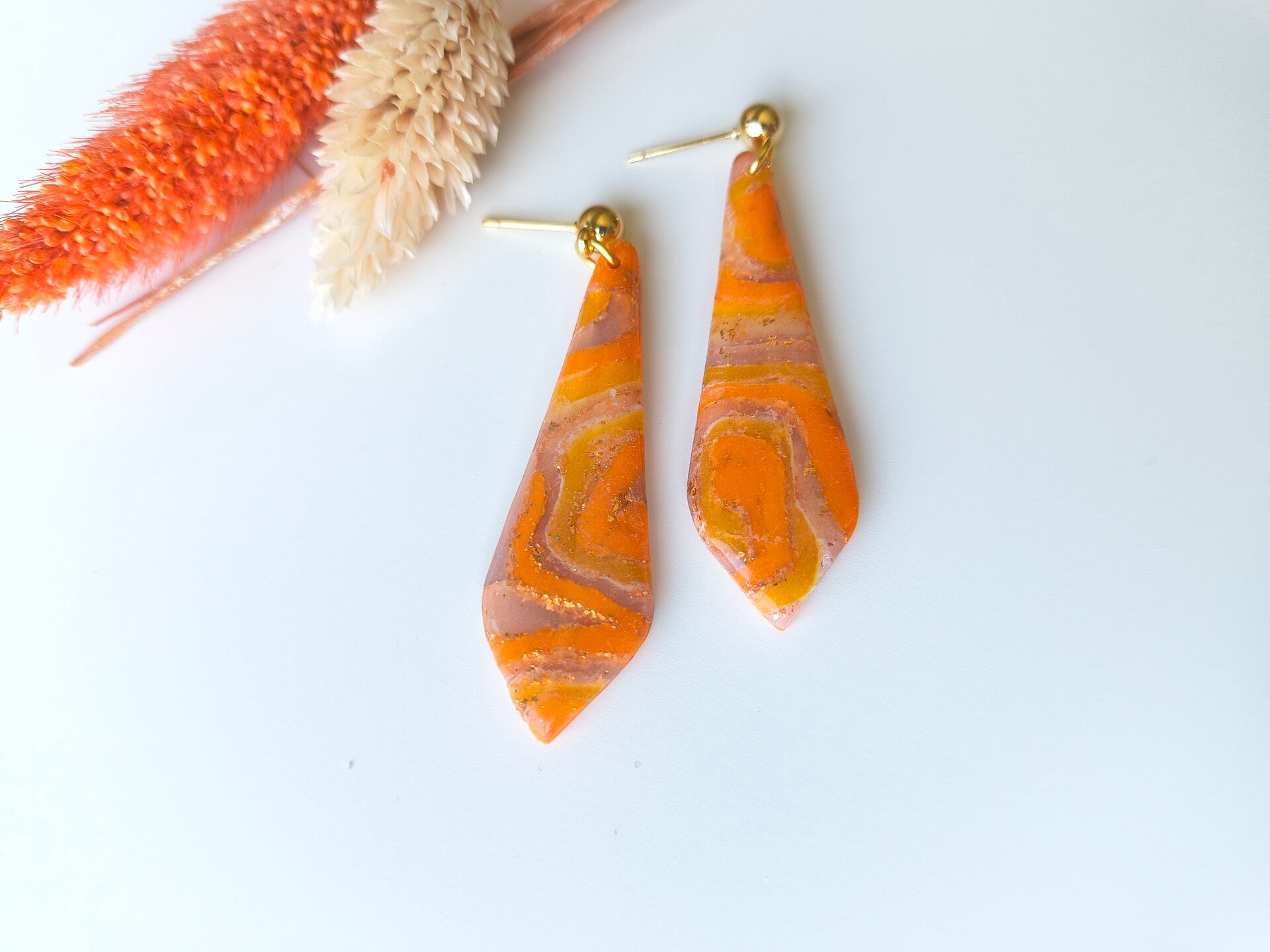 Stijlvolle roestkleurige oorbellen met rosé goudfolie afgewerkt. Een glanzend harslaagje maakt het helemaal af.