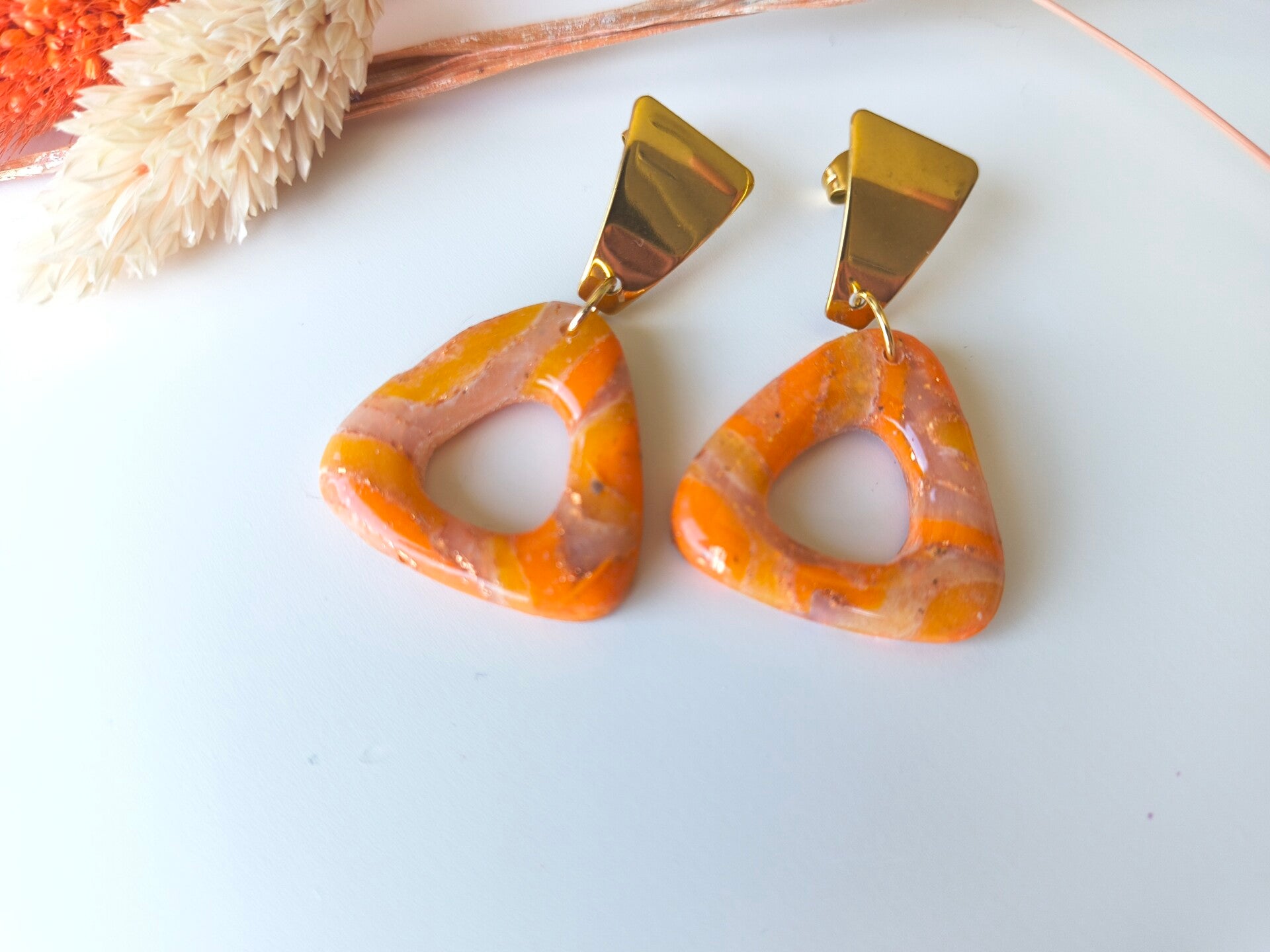 Stijlvolle roestkleurige oorbellen met rosé goudfolie afgewerkt. Een glanzend harslaagje maakt het helemaal af.